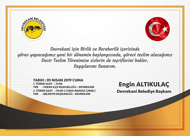 Devrekani Belediye Başkanlığı Devir Teslim Törenine Davet